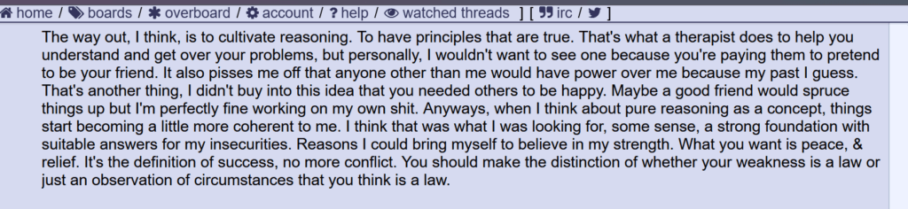 That’s another thing, I didn’t buy into this idea that you needed others to be happy. Maybe a good friend would spruce things up but I’m perfectly fine working on my own shit. Anyways, when I think about pure reasoning as a concept, things start becoming a little more coherent to me. I think that was what I was looking for, some sense, a strong foundation with suitable answers for my insecurities. Reasons I could bring myself to believe in my strength. What you want is peace, & relief. It’s the definition of success, no more conflict. You should make the distinction of whether your weakness is a law or just an observation of circumstances that you think is a law.